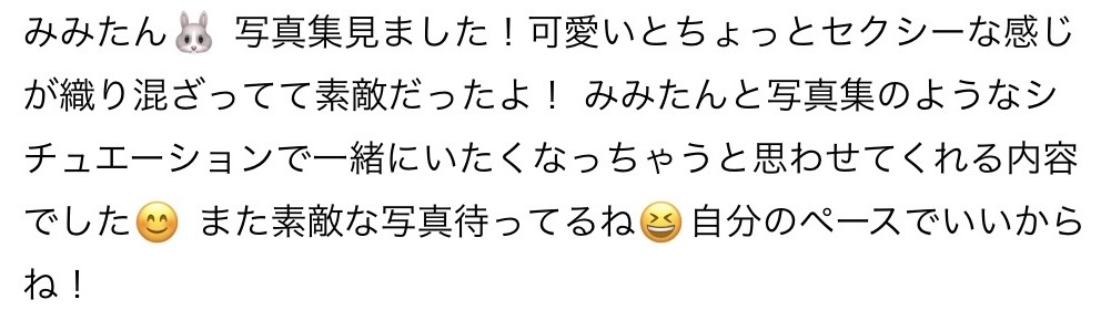 みみたんプログ読ませて頂きました。胸にコンプレックスあるなんて そんな事言ってはいけないよ。みみたんのお母様がお腹痛めてこの世に生を受けて今に至ってるんやし、他の女性より成長ホルモンが活発なの、そりゃ思春期の男性(中学生)は胸が大きいとずっと見続けたりしちゃうからね。僕もそういう経験あるから、みみたんが胸大きいの見られるの嫌な気持ちよくわかるの。でもね今のみみたんは第三弾の写真集で全てを見て欲しい、過去は振り返らずみみと言う進化した姿を見て欲しい感が凄く伝わってくるの。僕は嘘やお世辞言うのが嫌いな性格なんです(医療従事者してるからこんな性格になっちゃったんかも)でもほんまにみみは成長して来てると思うし、撮影の時も感極まって泣いたりしないと思ってるし、相棒のなっちゃんが側にいてくれて良かったと思うし、みみたんはなっちゃんやいいファンに恵まれてると思うよ。これからもみみたんをずっと応援していくし味方ですから。