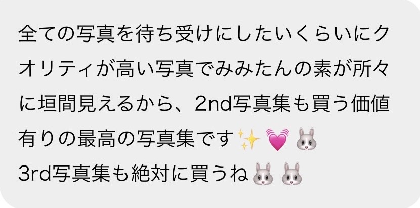 みみたんと一緒にいるみたいと言ってくださったり、特典の写真でドキドキしてくれたり、第3弾を楽しみに待ってくれている方もいて、読んでいて、「勇気を出して写真集を出してよかったな…」って心から思いました。